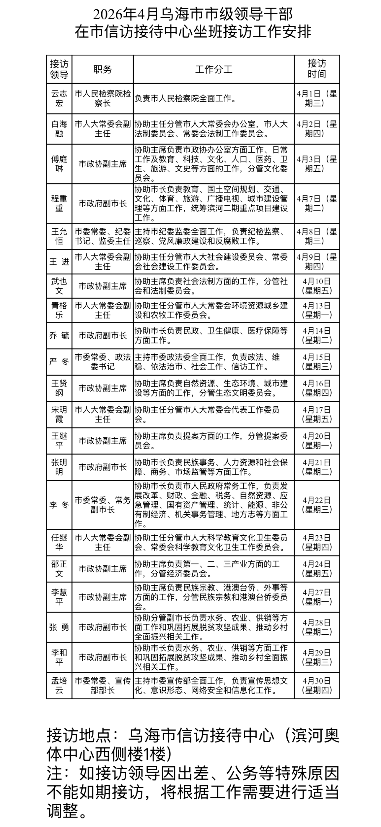 【接访工作安排】2026年4月乌海市市级领导干部在市信访接待中心坐班接访工作安排
